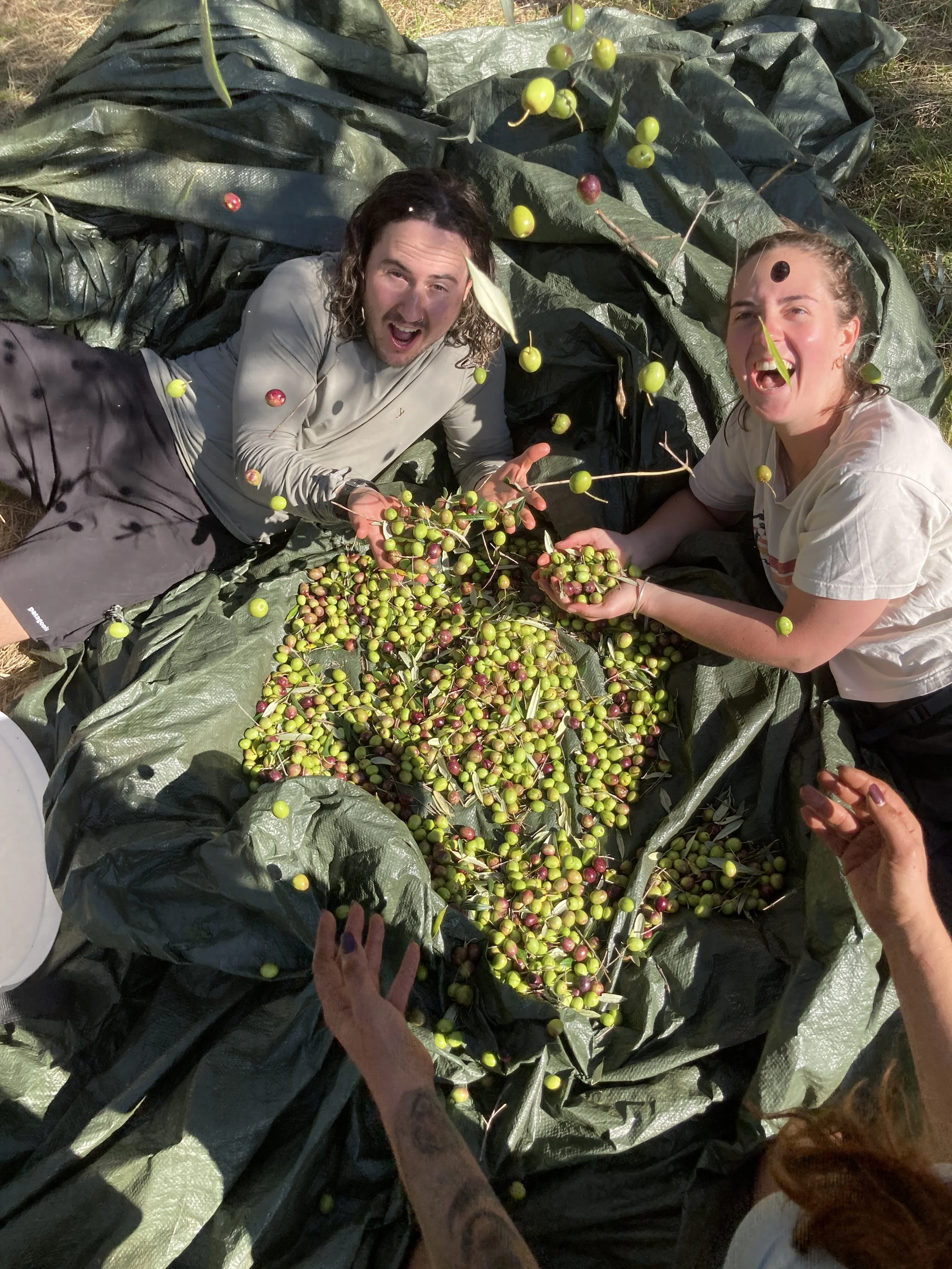 The next day was hot, probably one of the hottest of the trip so far. We found a really nice secluded bay on the map, with no main roads connecting it it seemed it would be nice and quiet. With some difficulty we managed to find the rocky track that led down to it. As we locked up our bikes and packed our lunch we could hear some loud music and chatter echoing up the valley. We enjoyed a swim with the beach almost to ourselves. There was an olive grove right next to the water and turns out it was olive harvesting time. There were lots of people busy working, drinking and singing! One of them, came over for a chat and invited us to come and say hi the the others on our way out. Of course we did, and in no time we had been roped in to help pick some olives. Not much olive picking was happening though; turns out it was a big group of friends from Slovenia helping their friend who owned the property. Not long after arriving we were offered special Slovenian liquor, homemade deer sausage and some other goodies.